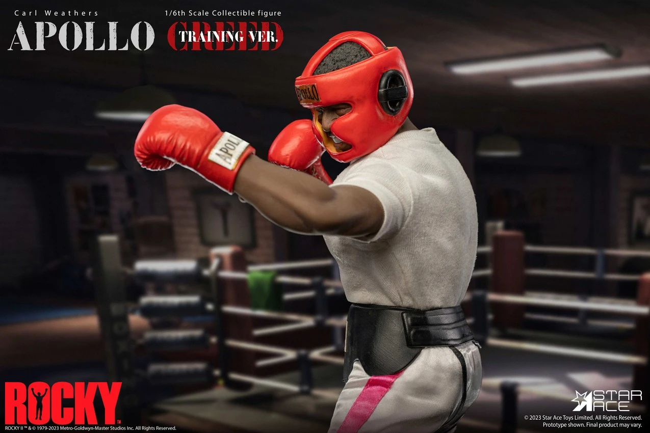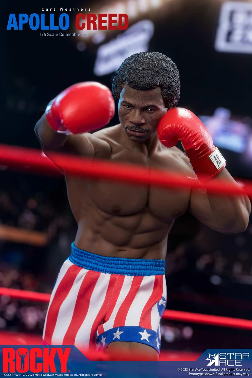 This Apollo Creed collectible features a head sculpt with an authentic likeness to Apollo and has a moveable eyes feature. He comes with interchangeable hands, boxing gloves, his signature American flag boxing shorts, the America flag hat, and the sleeveless coat that Apollo wears entering the ring.Â