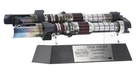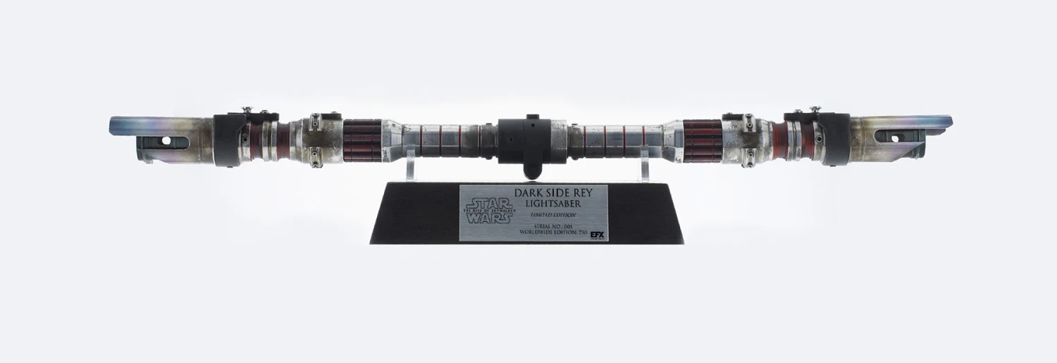EFX is proud to offer the Limited Edition prop replica of the “Dark Side” Rey Lightsaber from Star Wars: The Rise of Skywalker! It is machined out of solid aluminum with all metal details pieces. This replica is based on a detailed study of the actual prop and reference materials supplied by the Lucasfilm production team. This lightsaber is screen accurate not only in the geometry, but down to the detailed weathering, as well. Also, the hinge mechanism is the same one that was used in the actual prop.