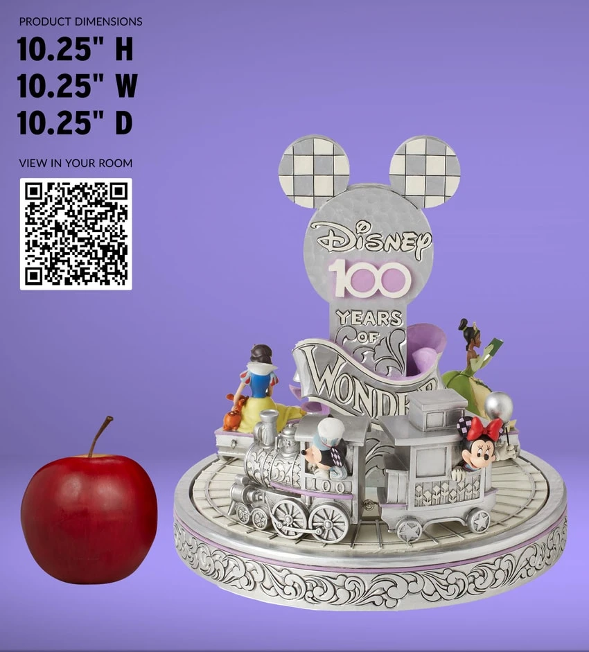 2023 marks the 100th anniversary of Disney. In honor of the momentous milestone, Jim Shore created this iconic limited edition train featuring Disney’s beloved characters. All aboard, with the push of a button, the train cars will move around the track.