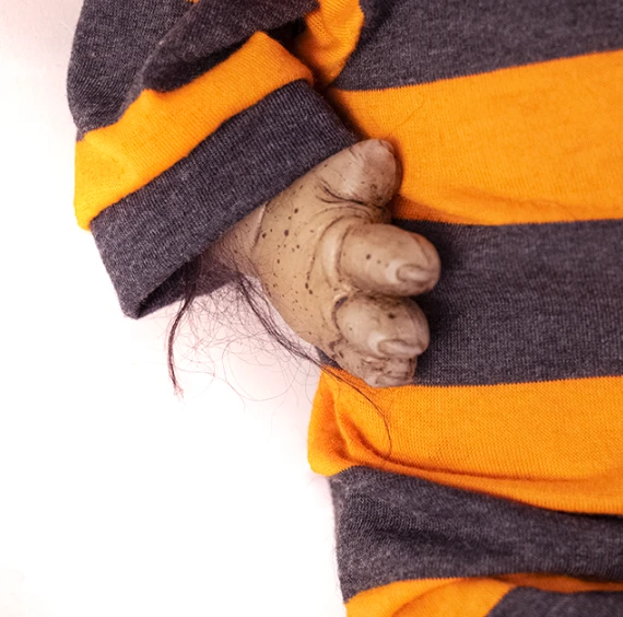 Cooper is the size and weight of a newborn with added spooky charm! He features a solid silicone head, arms and legs attached to a weighted plush furry body, giving the look and feel of holding a real live baby werewolf!